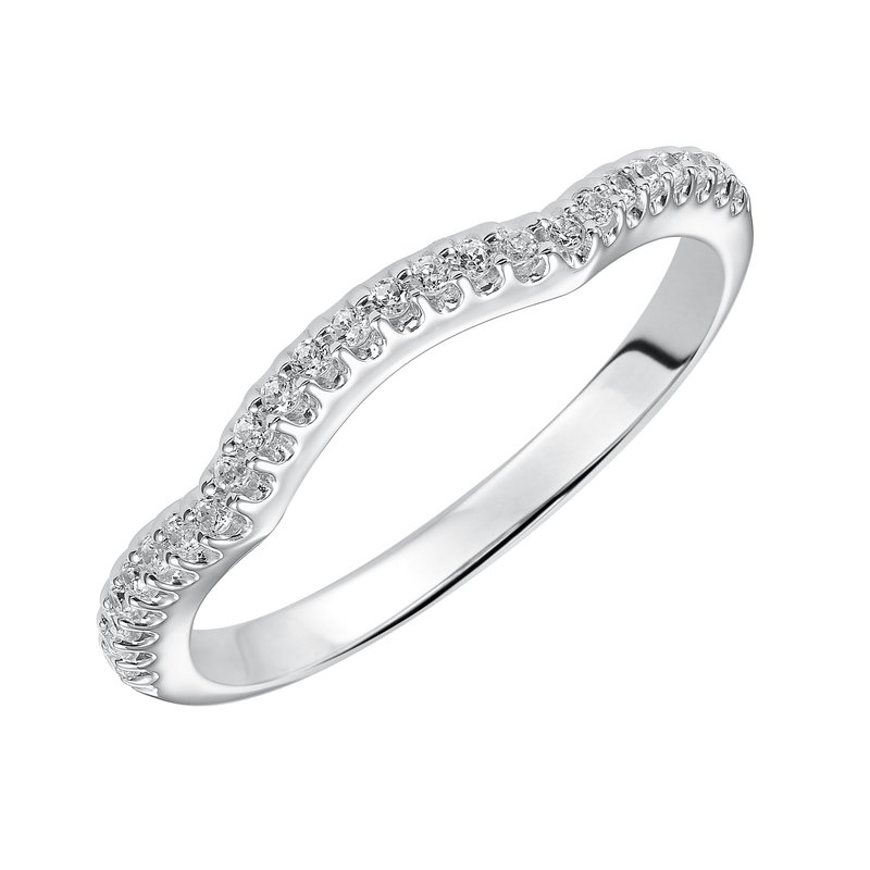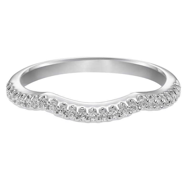 Wedding band with prong set, round diamonds and designed to fit flush with matching engagement ring.