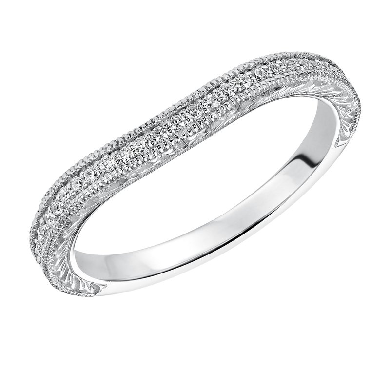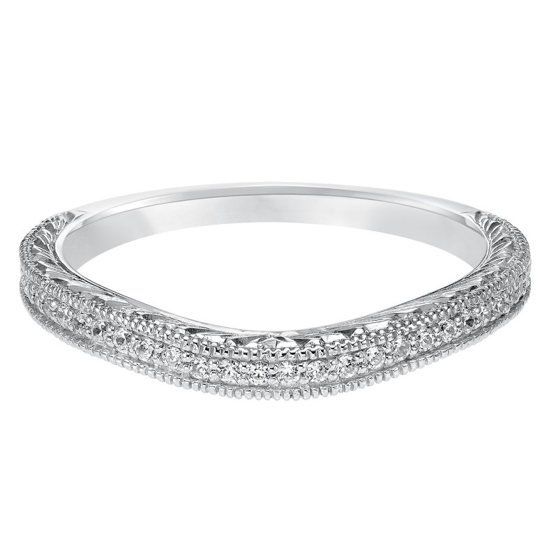 Wedding band with bead set, round diamonds, milgrain and engraving designed to fit flush with matching engagement ring.