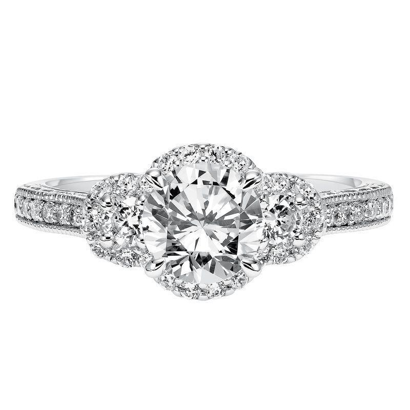 Bold, beautiful and timeless, this prong set diamond band with milgrain and engraving graces the band of this 3-stone diamond halo engagement ring