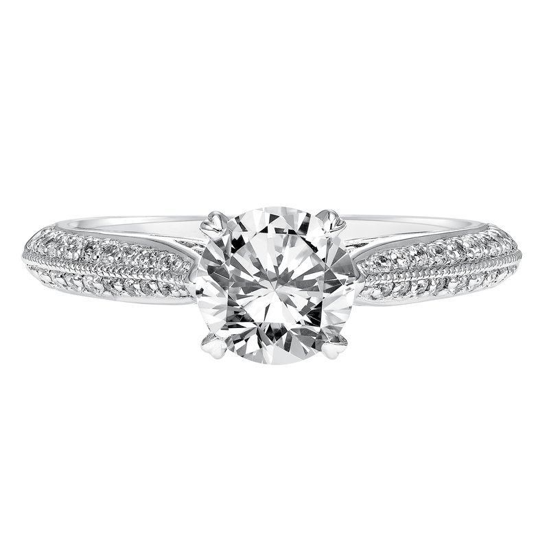 Graceful and elegant, this diamond engagement ring features a delicate diamond prong set band with milgrain details and engraving