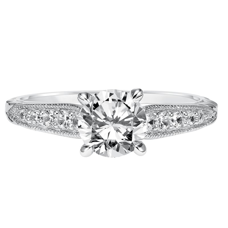 This charming diamond engagement ring features beautiful a diamond prong set band with milgrain details and an engraved design