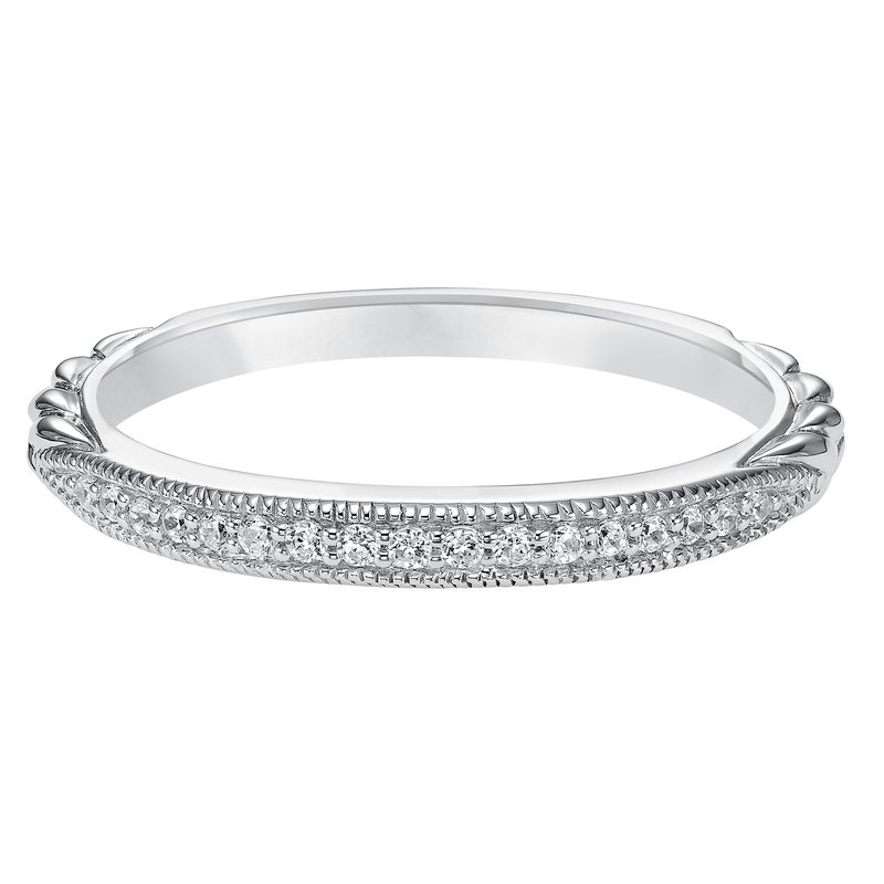 Wedding band with diamond enhanced, milgrain and engraved design.