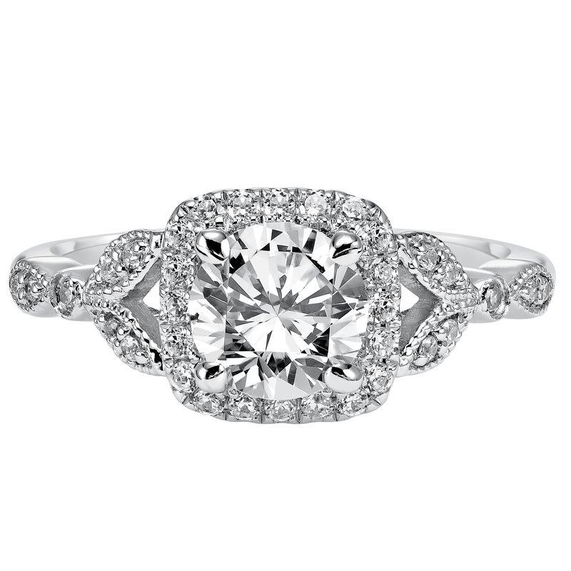 This whimsically styled engagement ring sparkles with its filigree and diamond halo and diamond prong set floral-inspired band