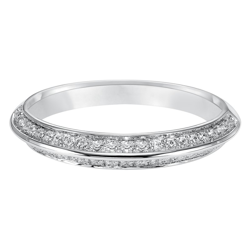 Wedding band with high polished, knife-edge center accentuated with round diamond enhanced sides.