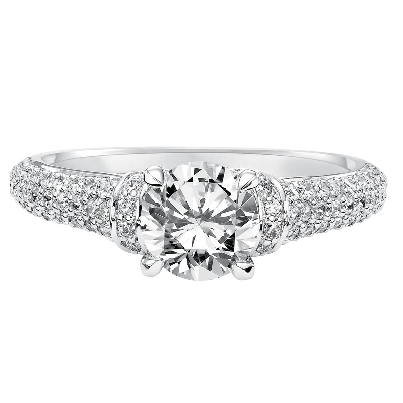 This engagement ring is infused with intricate diamond pave embracing the center diamond stone and elegant pave diamond band