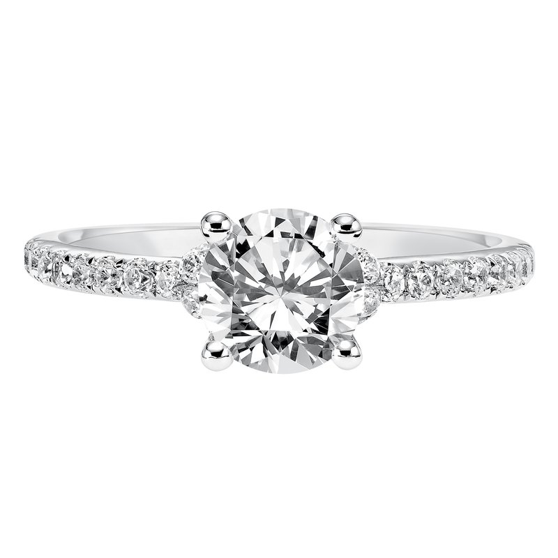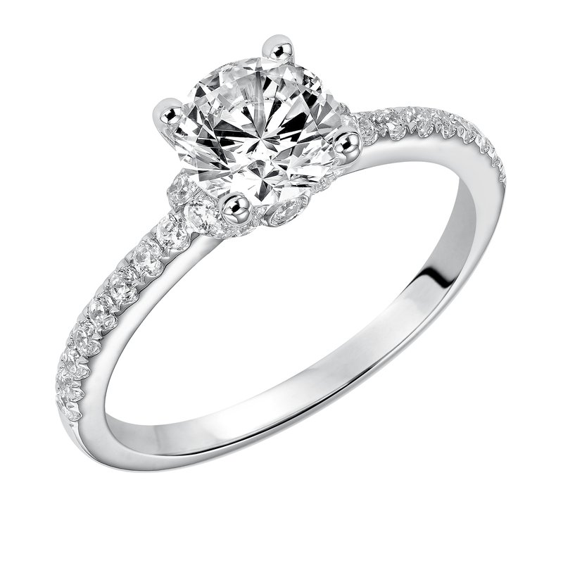 This engagement ring celebrates classic elegance with its delicate diamond prong set band and diamond tiara accent