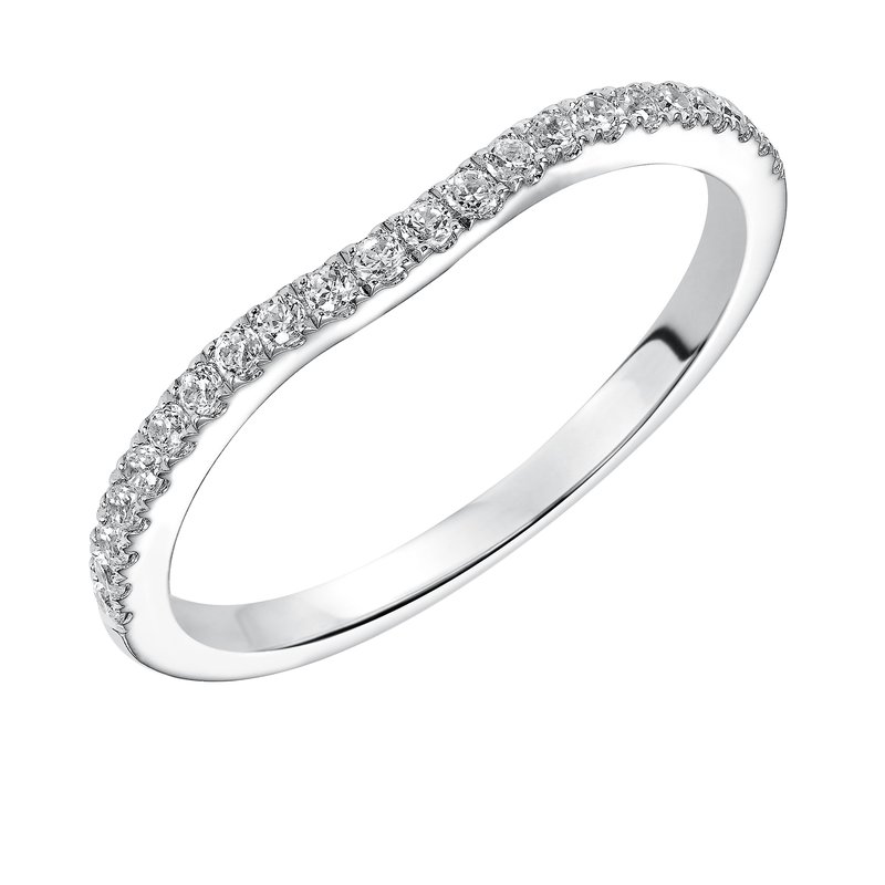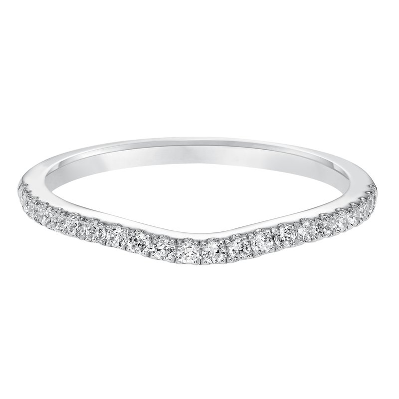 Wedding band with pave set, round diamonds and curved design to fit flush with matching engagement ring.