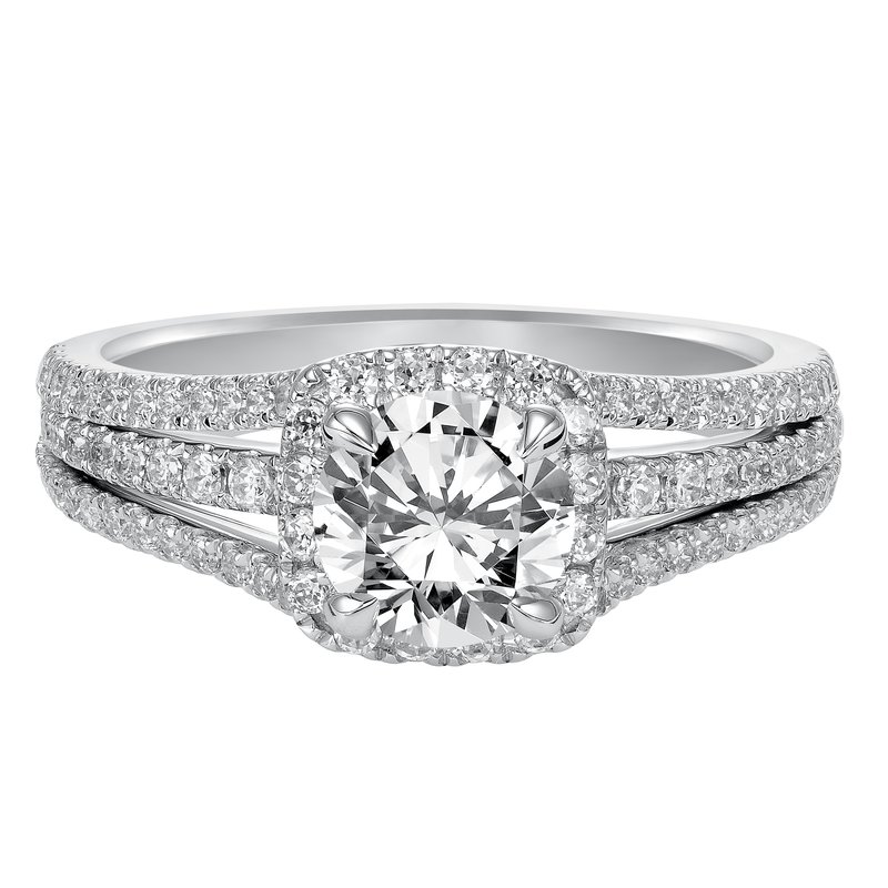 Dazzling with its three row diamond prong set band and single halo to accentuate the round center diamond this engagement ring will surely make a statement