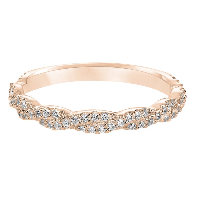 Wedding band with prong set, round diamonds and delicate twisted shank design.