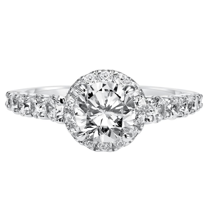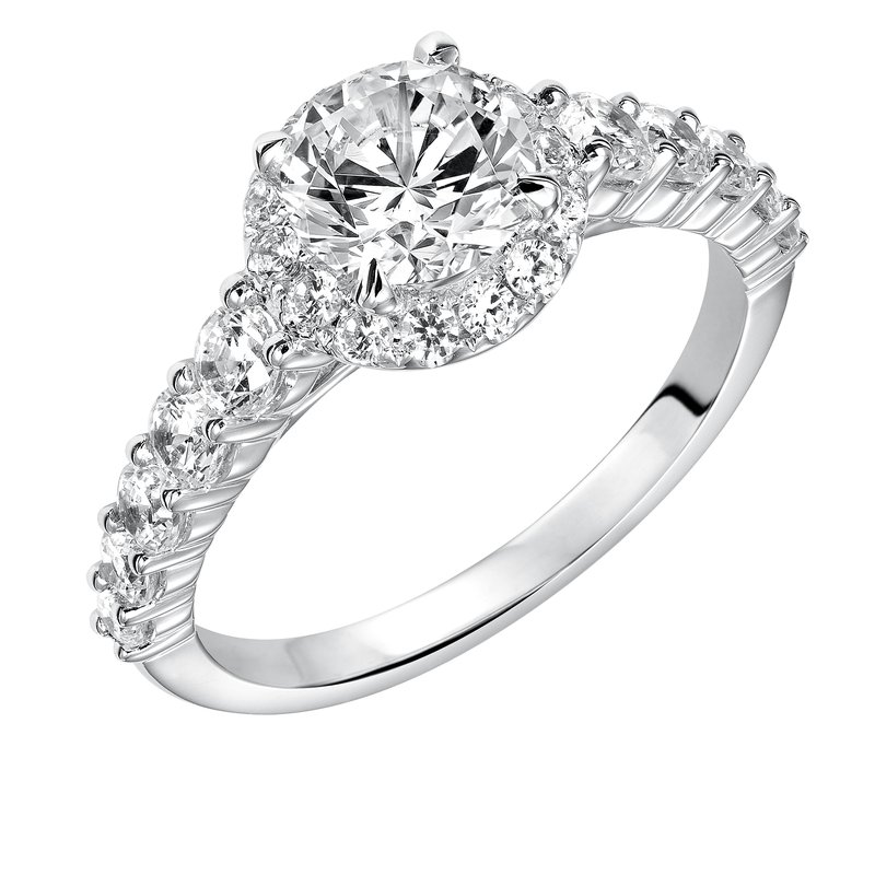 Magnificent and grand, this engagement ring was designed to accentuate the center diamond with its shared prong diamond halo and band for a show-stopping look