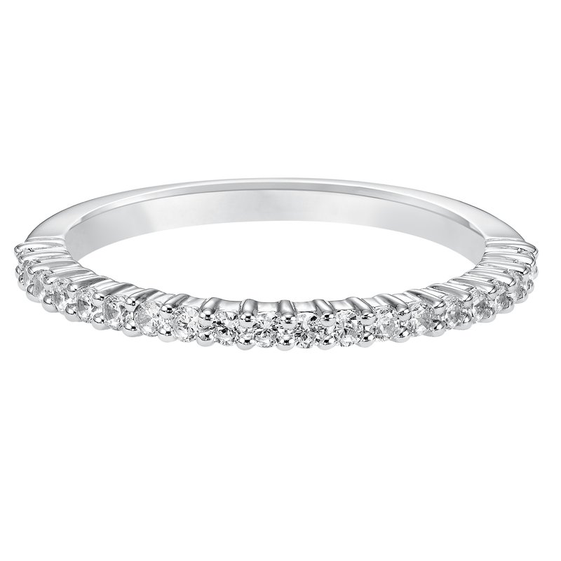 Wedding band with shared prong set, round diamonds.