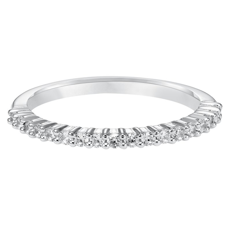 Wedding band with shared prong set, round diamonds.