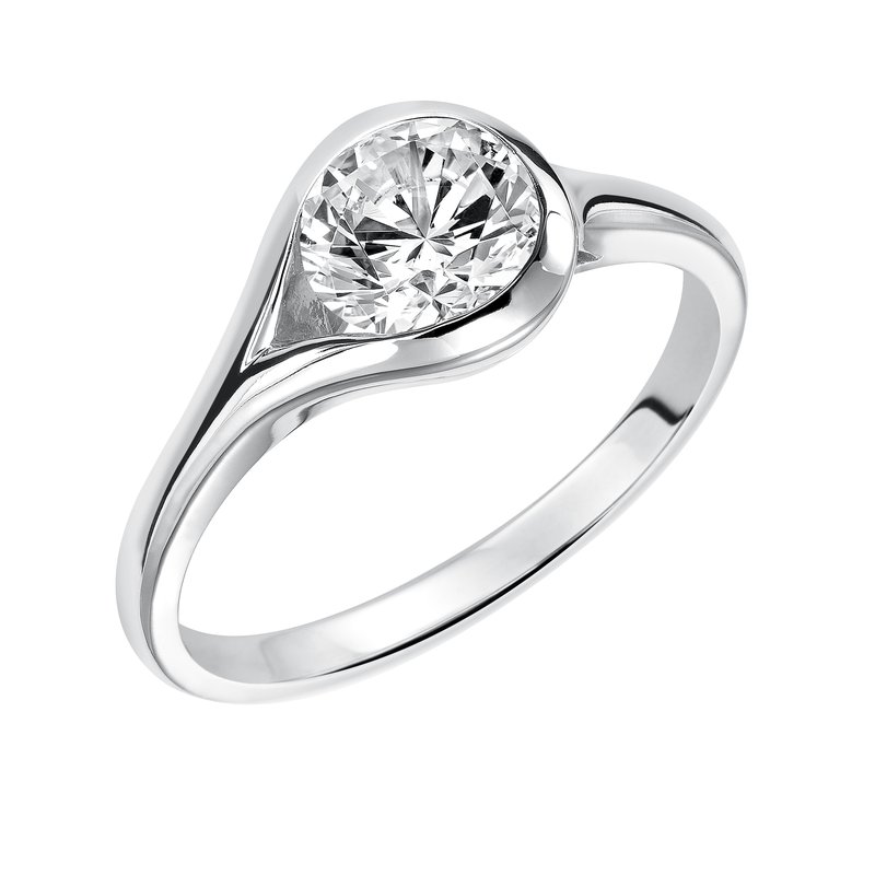 Chic and modern, this engagement ring is set beautifully in a high polished bezel set and bypass designed band