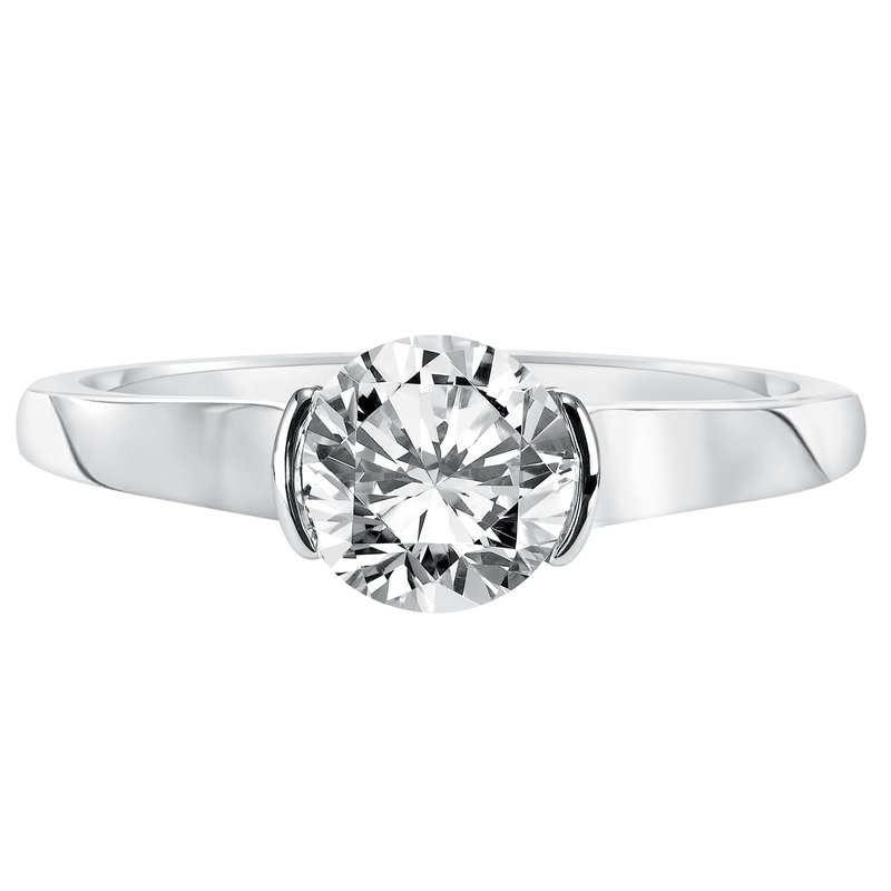 Gracefully designed, this modern half bezel engagement ring features a high polished band with a stunning criss-cross setting