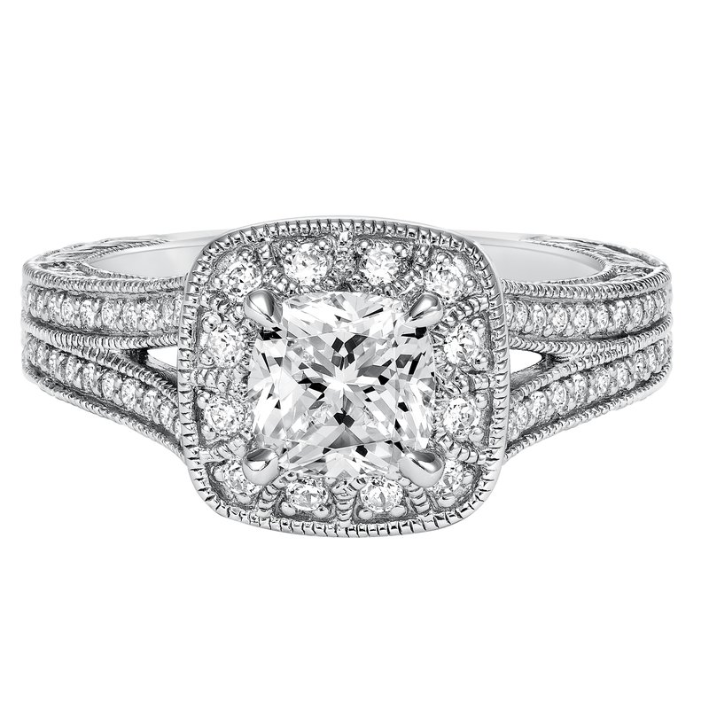 Diamond Prong Set Halo Engraved and Milgrain with Split Shank Engagement Ring