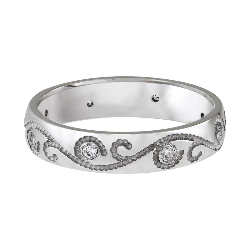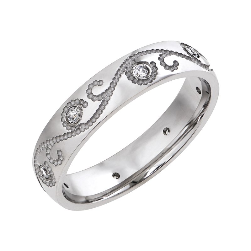 Wedding band with engraved design and diamond accents.