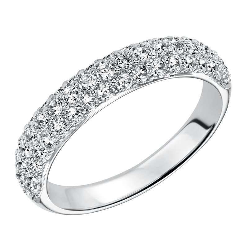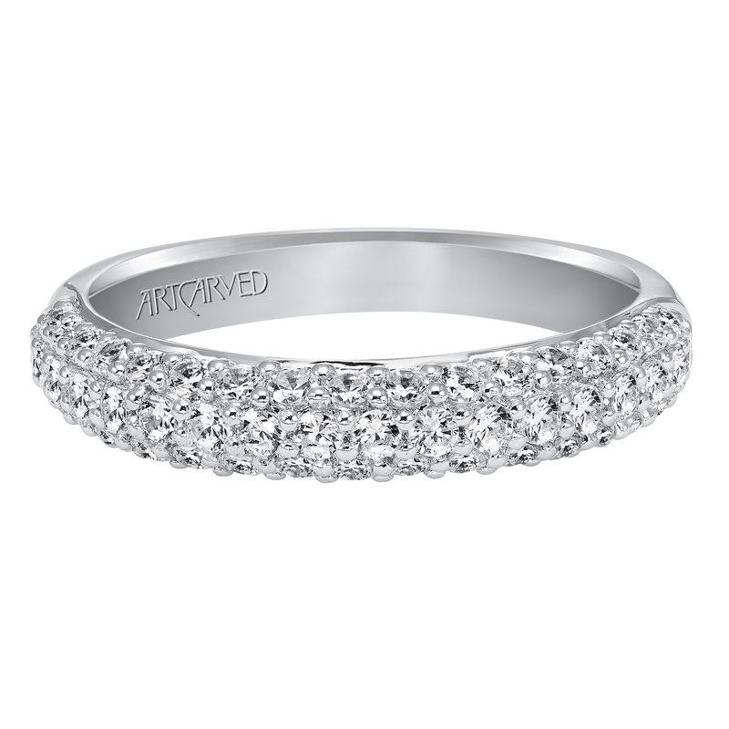 Wedding band with multi-row, round, bead set diamonds.