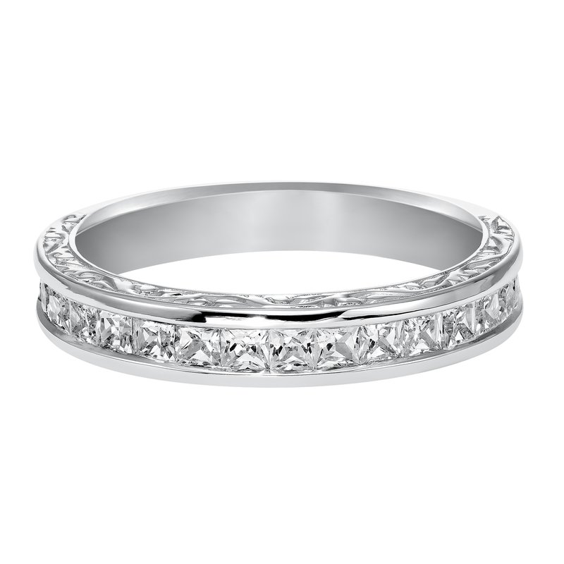 Wedding band with channel set, princess cut diamonds and engraved design.