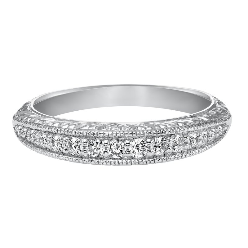 Wedding band with bead set, round diamonds, milgrain and engraved design.