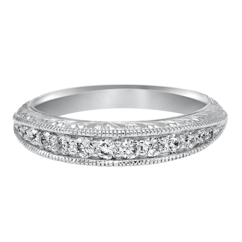 Wedding band with bead set, round diamonds, milgrain and engraved design.