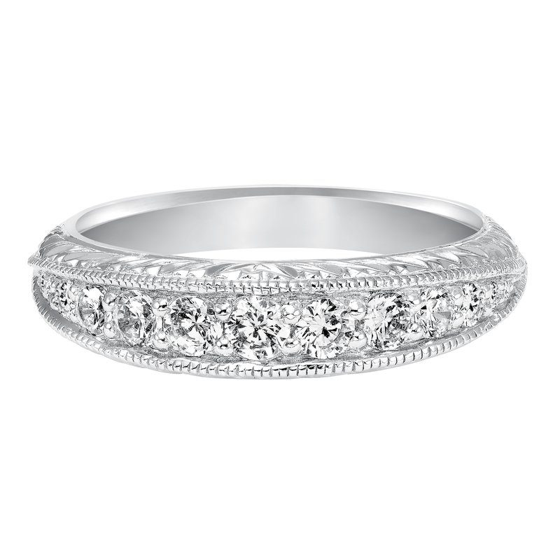 Wedding band with bead set, round diamonds, milgrain and engraved design.