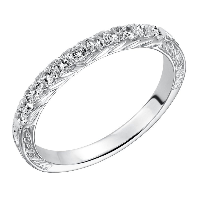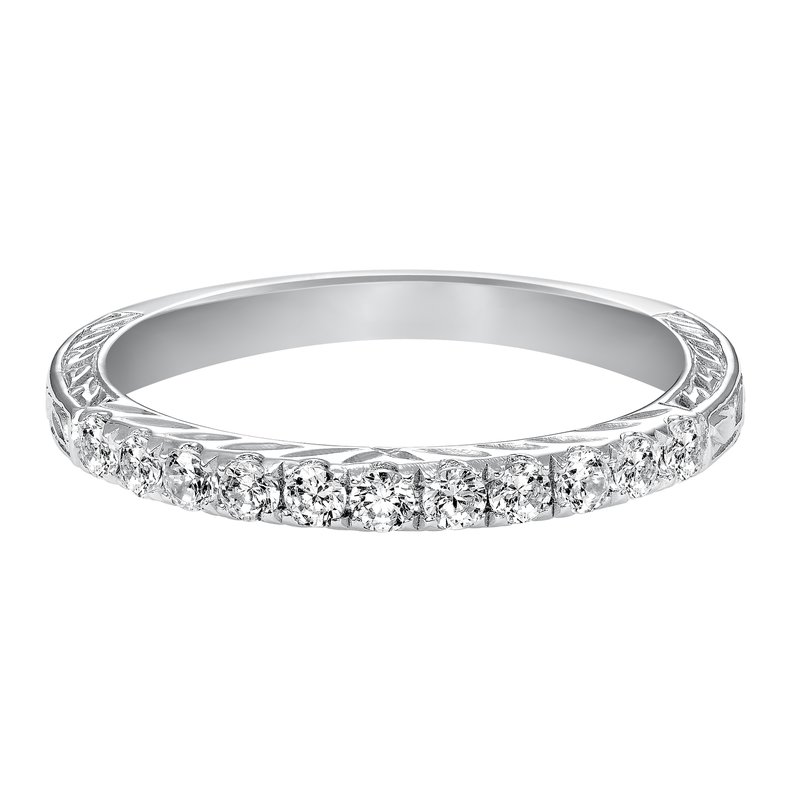 Wedding band with round, bead set diamonds and engraved design.