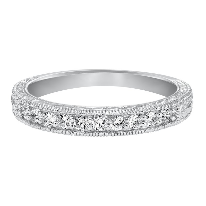 Wedding band with bead set, round diamonds, milgrain and engraved design.