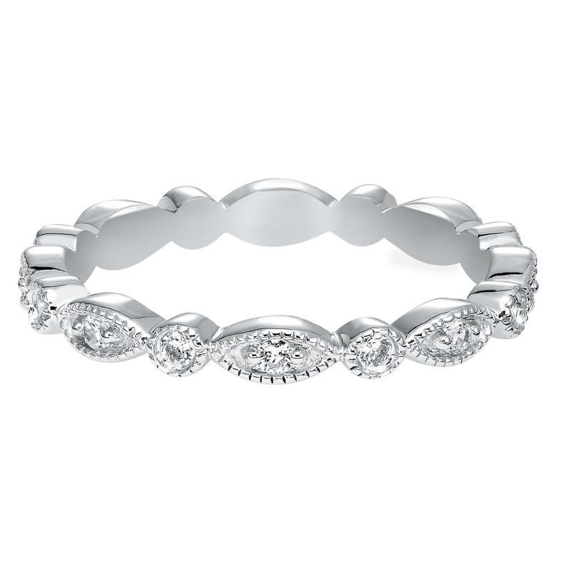Wedding band featuring a geometric-inspired design with round diamonds and milgrain.
