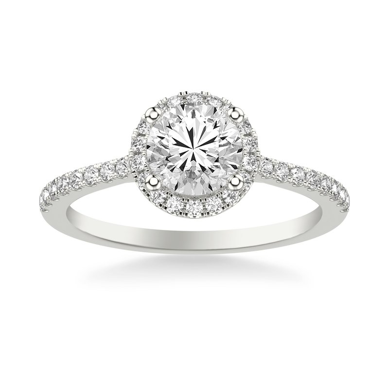 Traditional Diamond Round Halo Engagement Ring with Petite Diamond Shank Complete with Round Center Stone