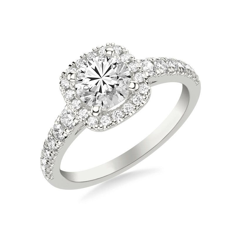 Traditional Diamond Cushion Halo Engagement Ring with Graduated Diamond Shank Complete with Round Center Stone