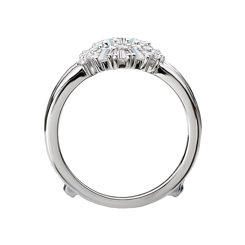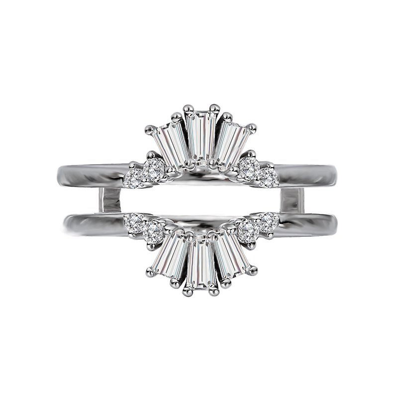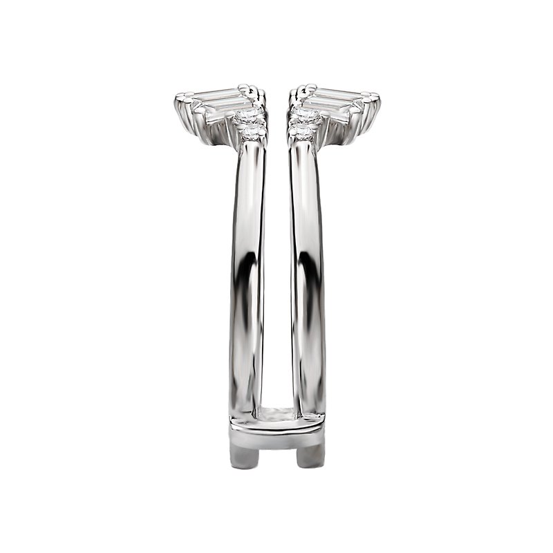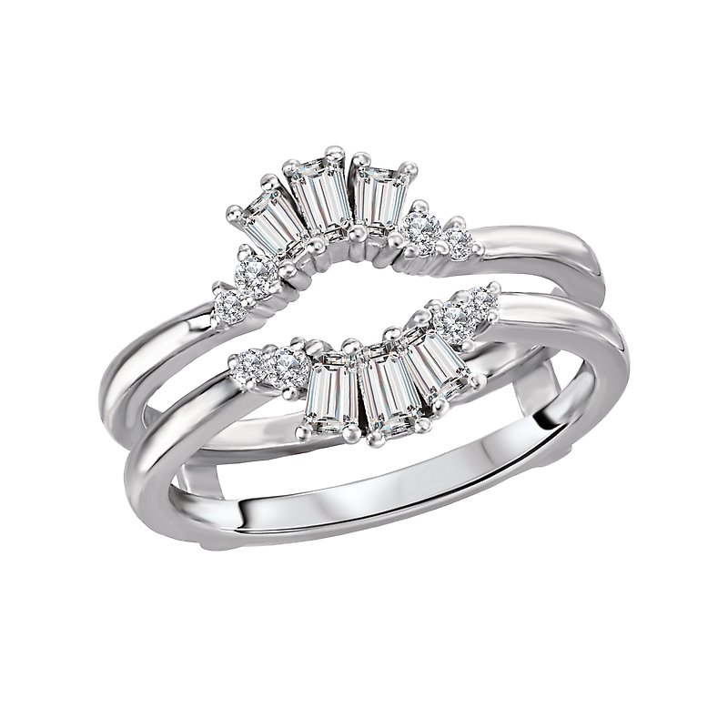 This 14kt white gold wrap ring with guard has round and tapered baguette diamonds that will surround a beautiful engagement ring. (D 3/8 carat total weight)