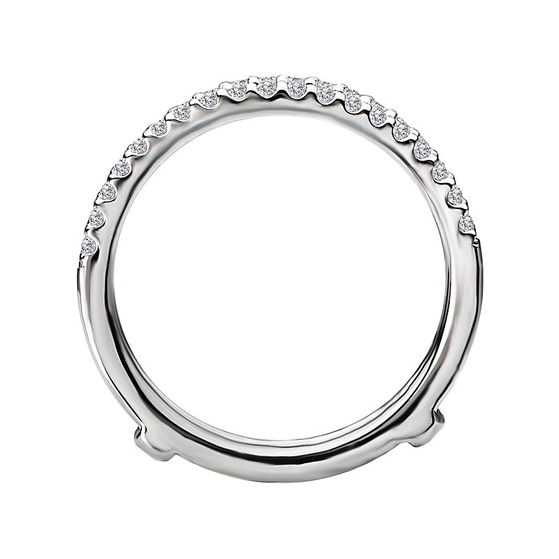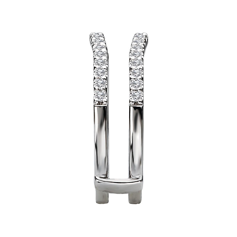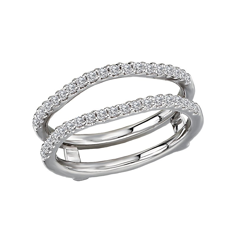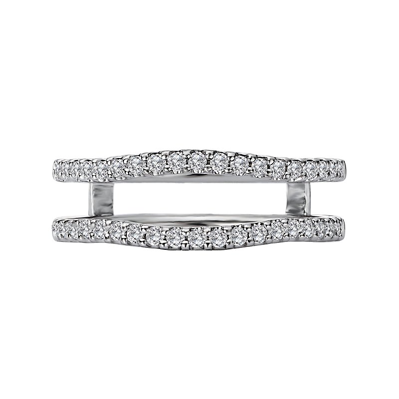 This 14kt white gold wrap with guard has two rows of round diamonds forming two slight curves that will surround a matching engagement ring. (D 1/3 carat total weight)
