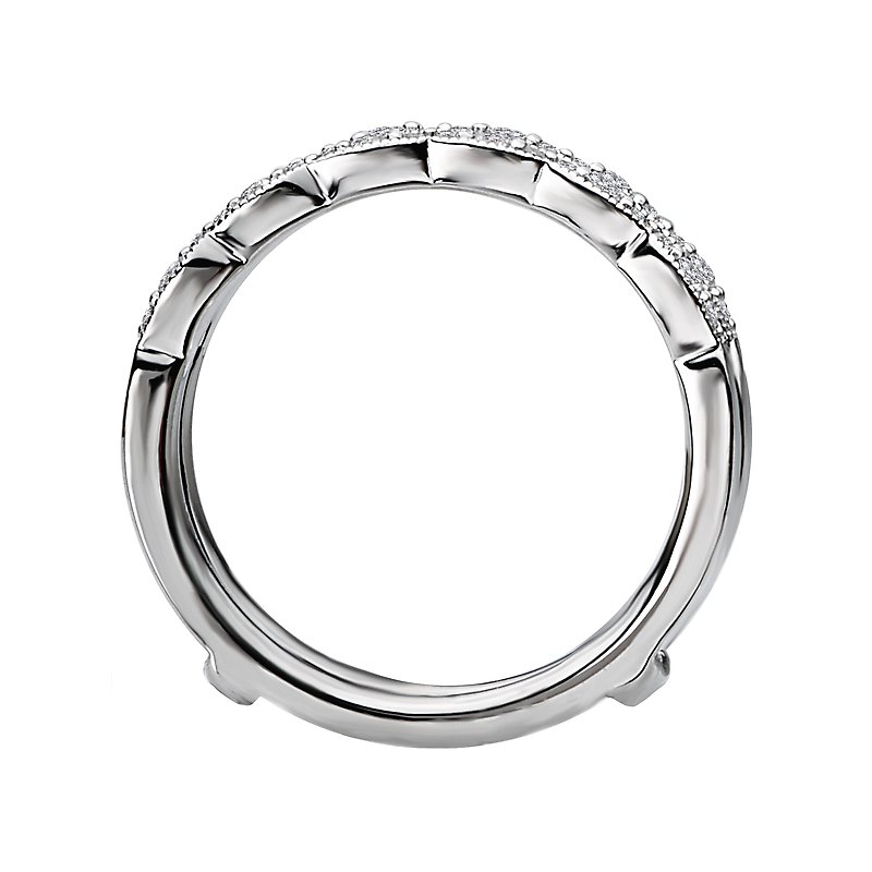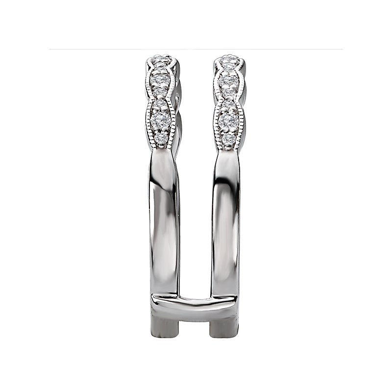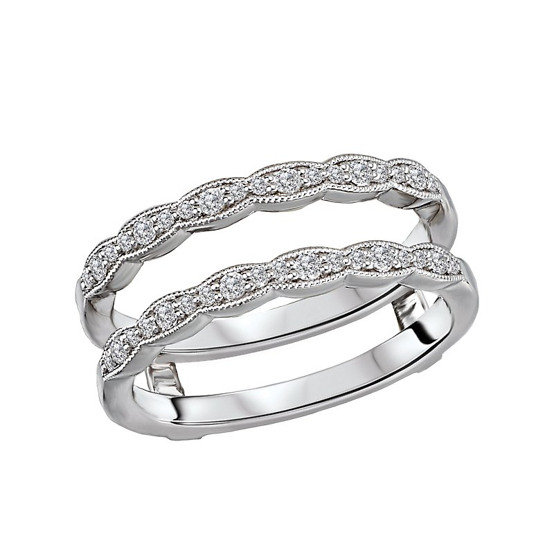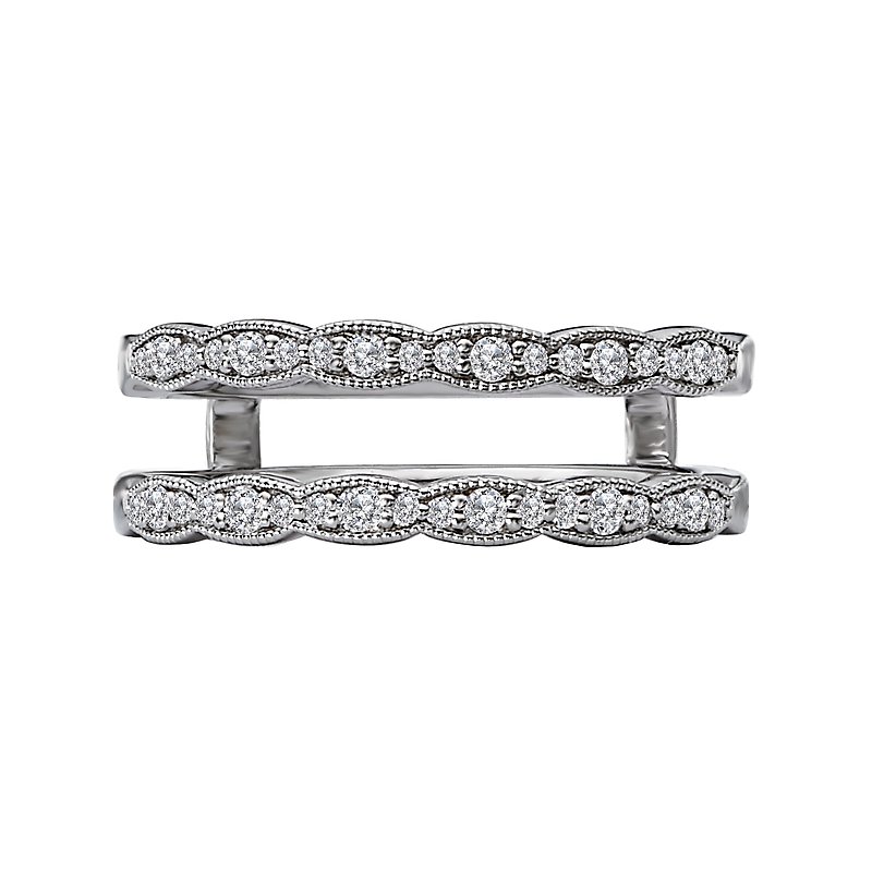 Two scalloped rows of 14kt white gold lined with round diamonds and milgrain design make this beautiful wrap ring. (D 1/4 carat total weight)