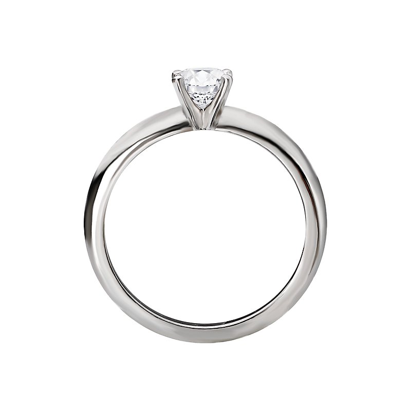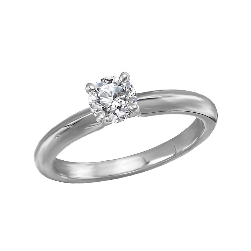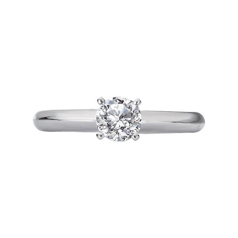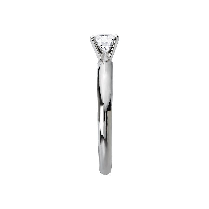 Classic semi-mount solitaire diamond ring features a 14kt white gold high polished band with a gorgeous 4 prong knife edge center setting that will accommodate a 5mm round diamond. (D 1/2 carat total)