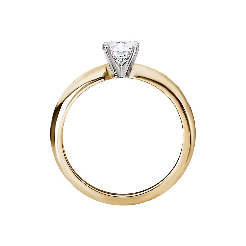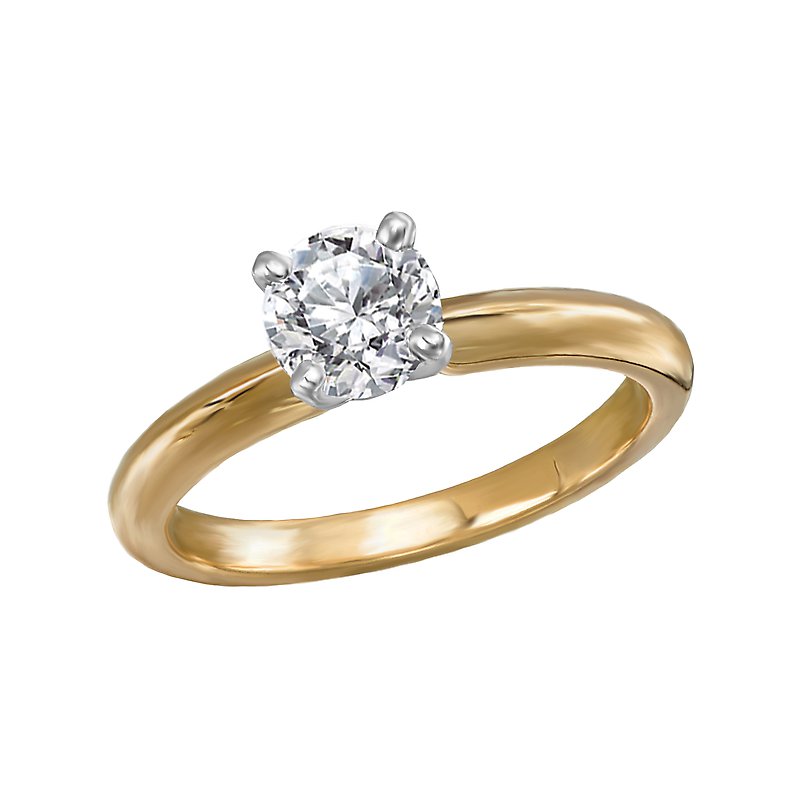 Classic semi-mount solitaire diamond ring features a 14kt yellow gold high polished band with a gorgeous 4 prong knife edge center setting that will accommodate a 5.8mm round diamond. (D 3/4 carat total)