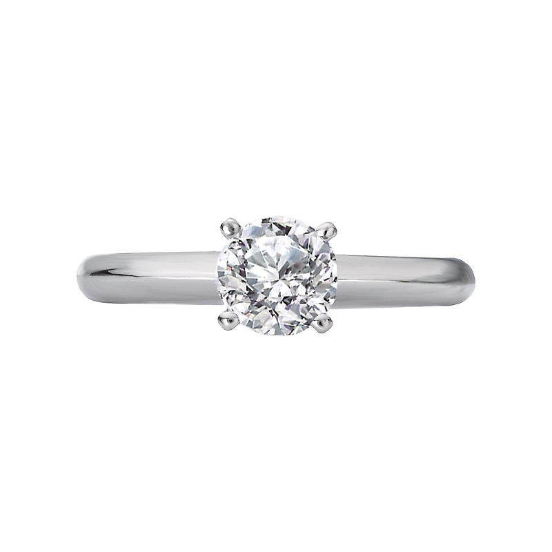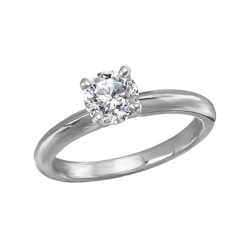 Classic semi-mount solitaire diamond ring features a 14kt white gold high polished band with a gorgeous 4 prong knife edge center setting that will accommodate a 5.8mm round diamond. (D 3/4 carat total)
