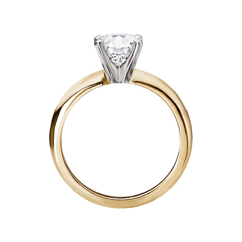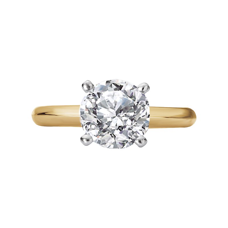 Classic semi-mount solitaire diamond ring features a 14kt yellow gold high polished band with a gorgeous 4 prong knife edge center setting that will accommodate a 8.2mm round diamond.