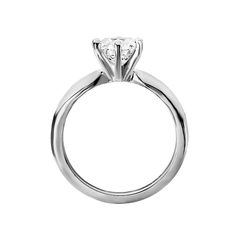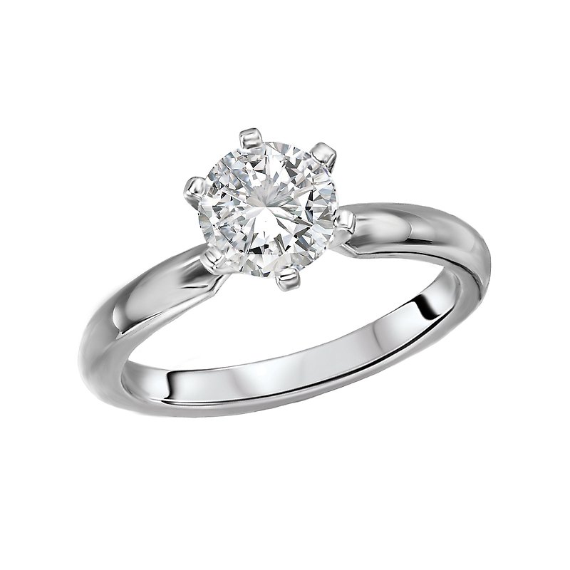 Classic solitaire diamond ring features a 14kt white gold high polished band with a gorgeous 6 prong knife edge center setting that will accommodate a 6.5mm round diamond.