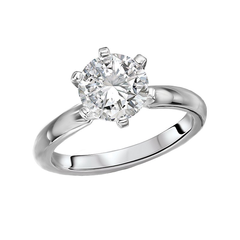 Classic solitaire diamond ring features a 14kt white gold high polished band with a gorgeous 6 prong knife edge center setting that will accommodate a 7.4mm round diamond.