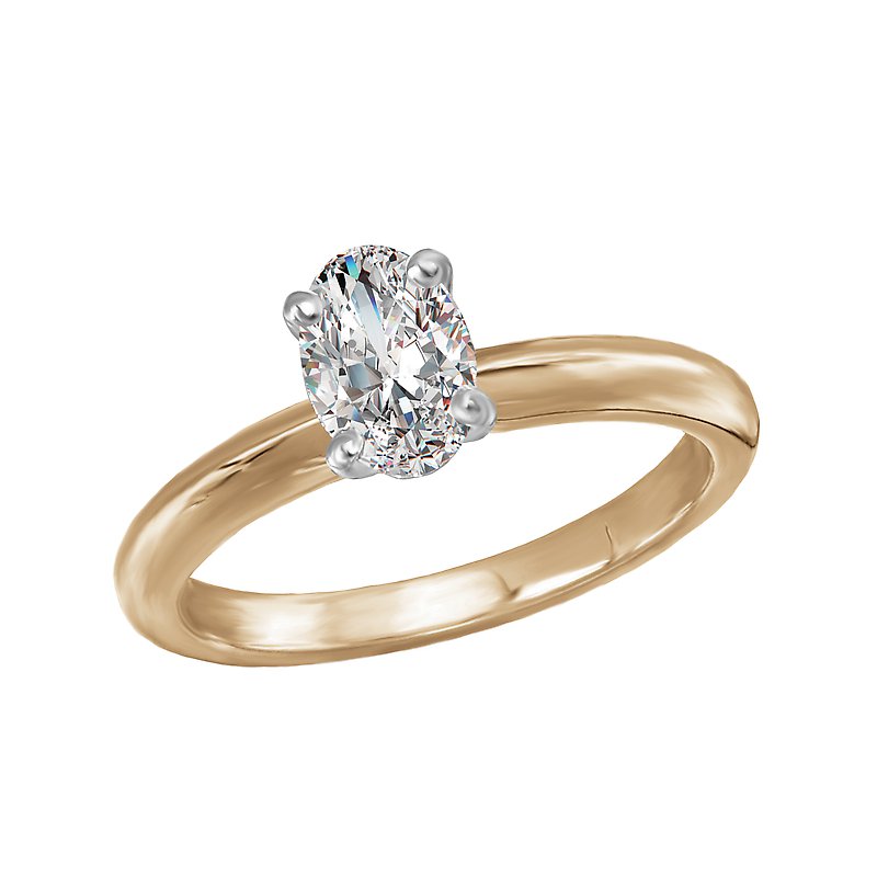 This solitaire has a 14kt yellow gold band with a setting that will accommodate an oval 3/4 carat diamond.