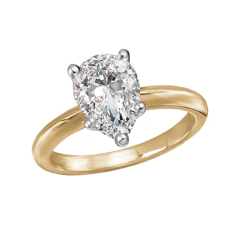 This solitaire has a 14kt yellow gold band with a setting that will accommodate a pear shaped 1.5 carat diamond.