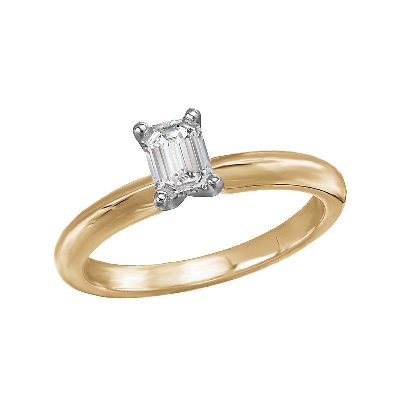 This solitaire has a 14kt yellow gold band with a setting that will accommodate an emerald shaped 1/2 carat diamond.
