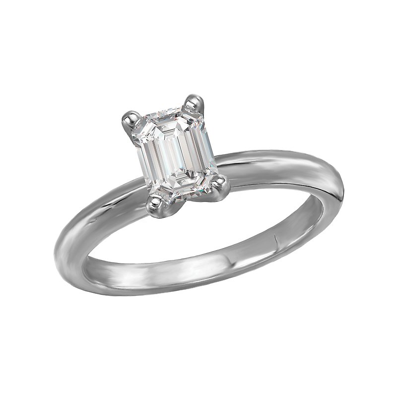 This solitaire has a 14kt white gold band with a setting that will accommodate a emerald shaped 1 carat diamond.