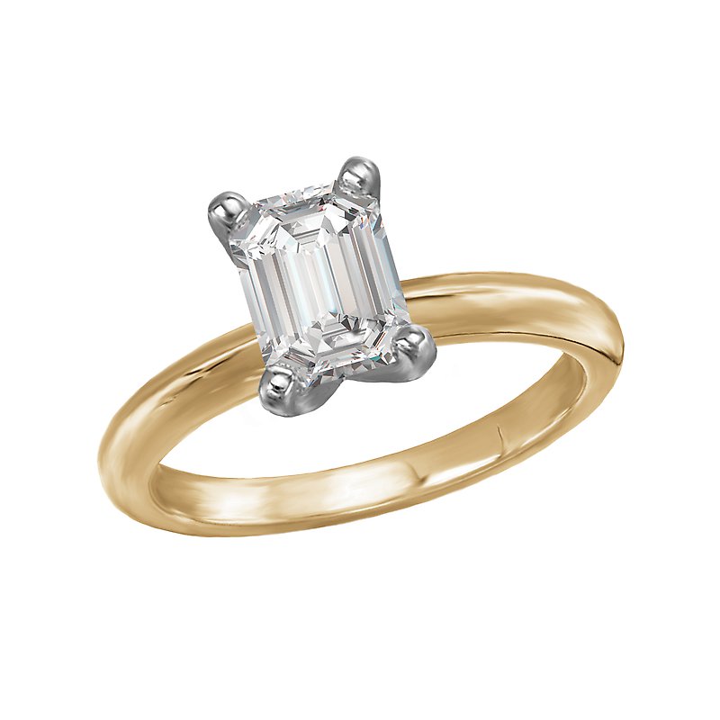 This solitaire has a 14kt yellow gold band with a setting that will accommodate a emerald shaped 1-1/4 carat diamond.
