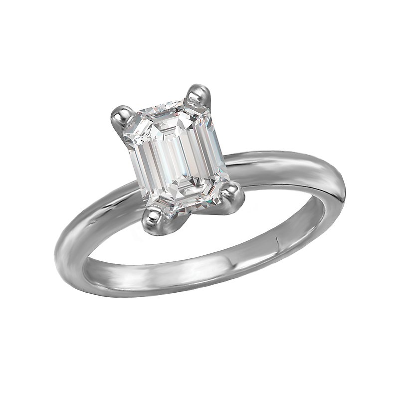 This solitaire has a 14kt white gold band with a setting that will accommodate a emerald shaped 1-1/2 carat diamond.