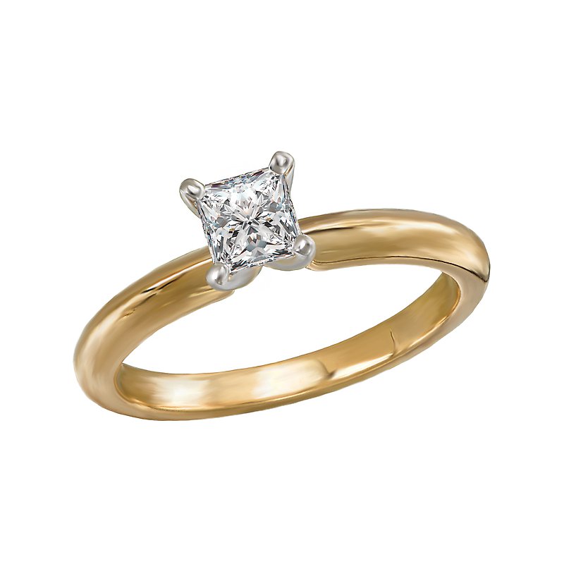 This solitaire has a 14kt yellow gold band with a setting that will accommodate a princess cut 3/4 carat diamond.