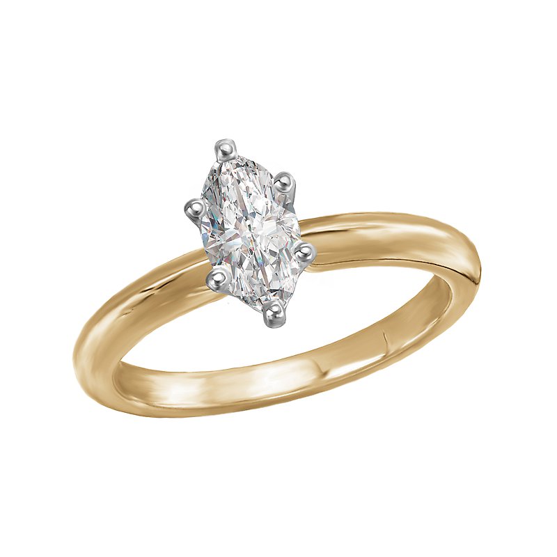 This solitaire has a 14kt yellow gold band with a setting that will accommodate a marquise cut 3/4 carat diamond.