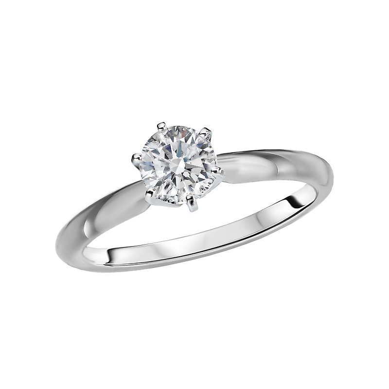 This high polished 14kt white gold solitare ring features 6 prong setting that holds a 1/2 carat diamond. (D 1/2 carat total weight)