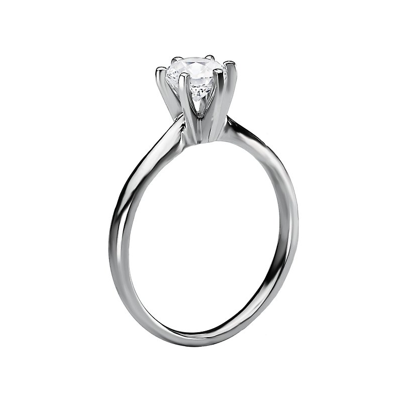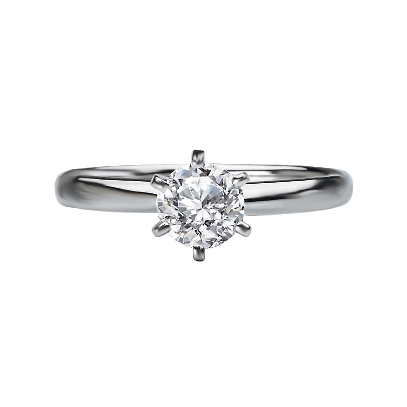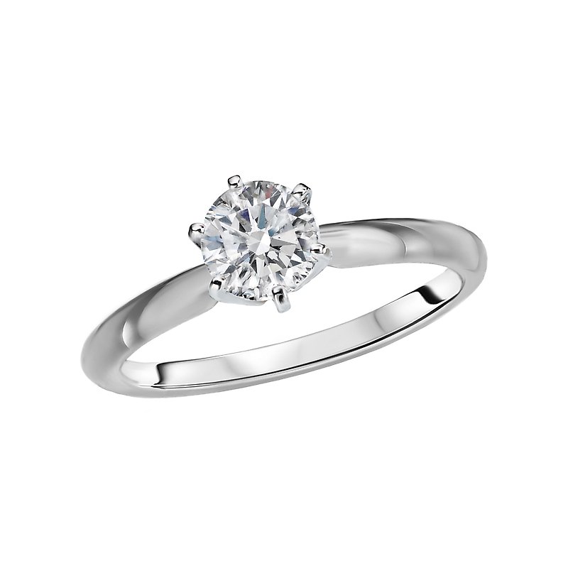 This high polished 14kt white gold solitare ring features 6 prong setting that holds a 3/4 carat diamond. (D 3/4 carat total weight)