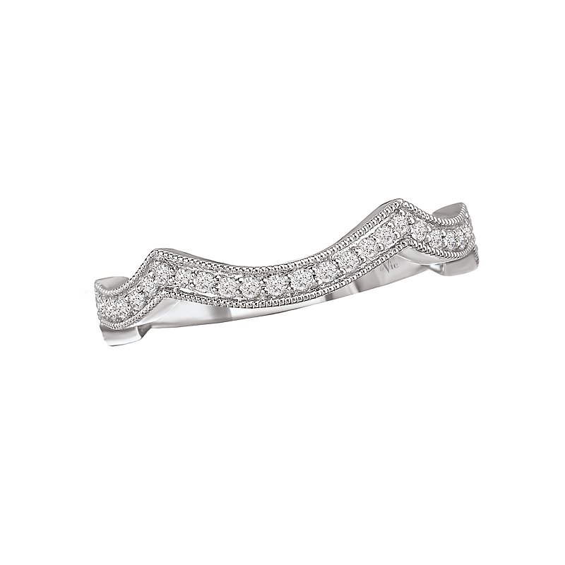 Scalloped curved wedding band with round diamonds set in 14kt white gold and milgrain detail. (D 1/5 carat total weight)